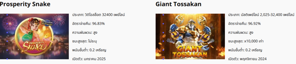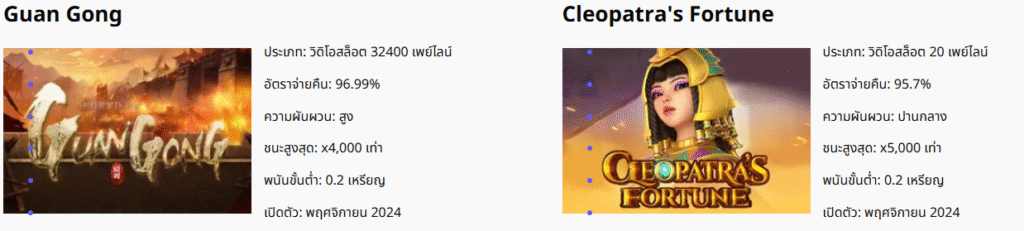 เกมที่ได้รับการพูดถึงมากที่สุด ได้แก่ Big CaiShen Megawins และ Cleopatra’s Fortune เนื่องจากเป็นเกมระบบโปรเกรสซีฟแจ็คพ็อต และเหมาะกับผู้เล่นที่ต้องการลุ้นรางวัลใหญ่